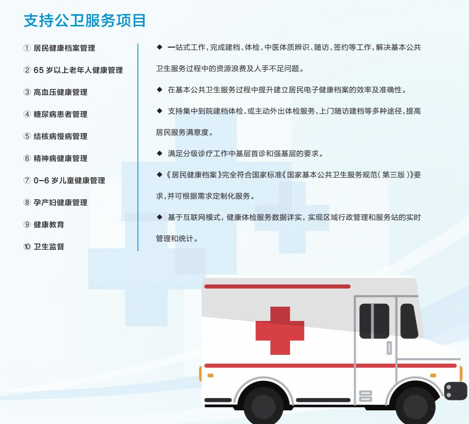 支持國(guó)家公衛(wèi)體檢,《居民健康檔案》完全符合國(guó)家標(biāo)準(zhǔn)《國(guó)家基本公共衛(wèi)生服務(wù)規(guī)范(第三版)》要求。